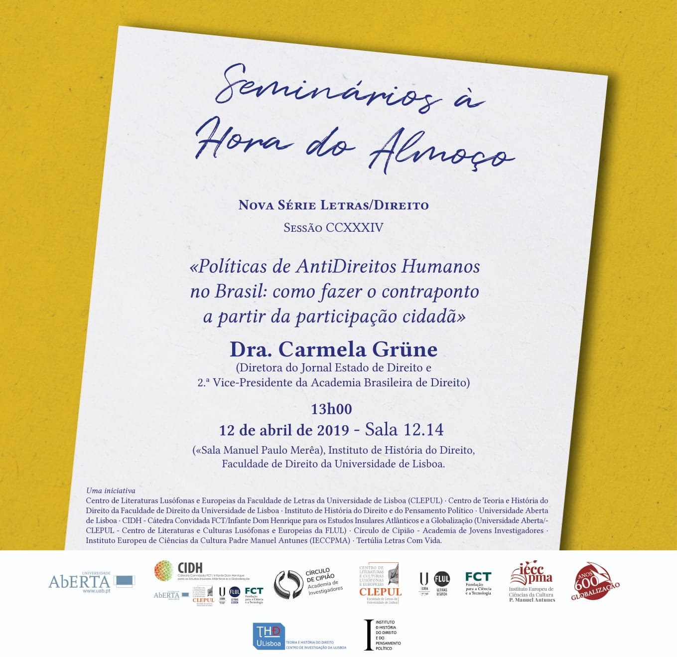 A convite do professor historiador José Eduardo Franco, Catedrático da Universidade Aberta e Diretor Adjunto do Centro de Literaturas e Culturas Lusófonas e Europeias da Faculdade de Letras da Universidade de Lisboa, a advogada e ativista dos Direitos Humanos Carmela Grüne participou no dia 12 de abril, entre 13h e 14h, em Lisboa, do Seminários à Hora do Almoço, abordando o tema “Políticas de AntiDireitos Humanos no Brasil: como fazer o contraponto a partir da participação cidadã”.
